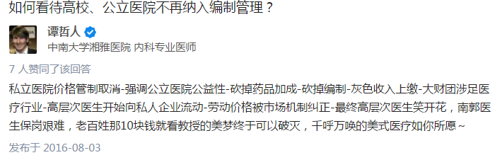 几年前,有人问我私人医院是否能够崛起,我表示不太现实。对于私人医院的开办,除了私人办医政策的扶植之外,私人医院的困在在于缺人不缺物。对于要起高楼,要买仪器这些事,有钱人真的可以为所以为。但是私人医院缺人,一方面是医疗人才,一方面是病人;如果想要成为生力军,就要脱离男科性病的范围,要引进真正的医疗人才,可是公立医院医生是定点单位职业,不能乱跑,房子几年可以盖好,设备有钱就可以买到,可是医疗人才培养周期就长,高水平医生还有多年工作经验做积累,不是你想有就凭空冒出来的,想快速发展就只能挖人,而目前中等以上水平医生都集中在公立医院,他们还要考虑到晋职称,大学教职,科研课题申报,研究生导师资格等等,没有太多理由跳槽。而病人跟着医生走,而且现有的价格体制下,公立医院医生的劳动价值被低估,实际上医疗体系已经处于变相的福利,私人医院没有任何价格上的优势,想学美国,我并不看好。